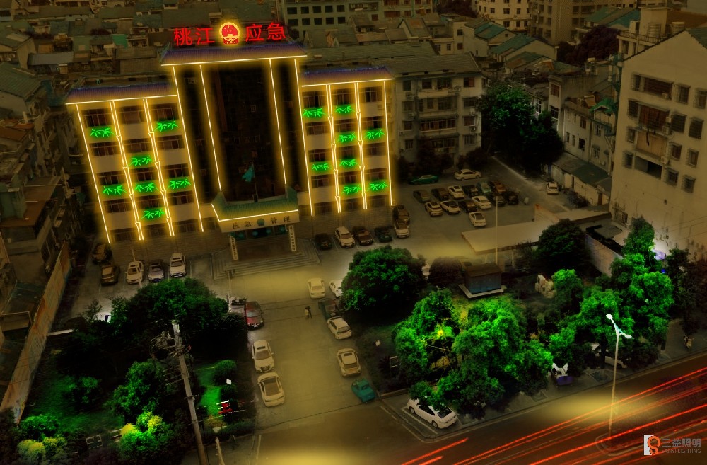 桃江縣公安交警大隊、事故入處理中心外墻燈光設(shè)計方案,采用線條燈勾勒大樓輪廓。